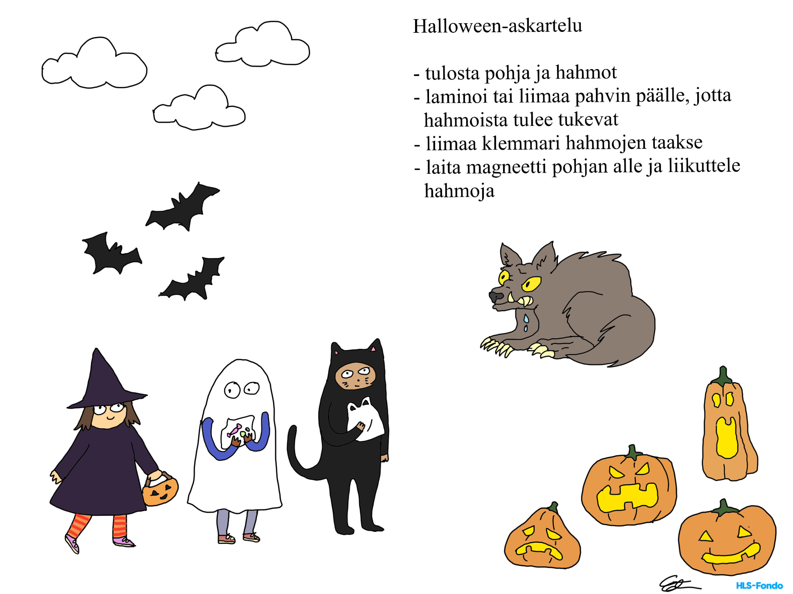 Harjoittele nimeämistä, kerrontaa tai sijaintikäsitteitä Halloween-aiheisten hahmojen ja taustan kanssa. Tehtävässä voi harjoitella sanoja kuten vasemmalla, takana, alla, ylhäällä ja vieressä, samalla kun luodaan oma kummitustarina. Taustana toimii Halloween-maisema.